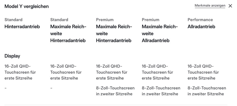Seit Freitag bietet Tesla die „Premium“-Ausführungen des Model Y jetzt auch in Europa mit den Verfeinerungen des Innenraums an. Die „Standard“-Modelle erhalten ebenfalls das neue Display, nicht aber den dunklen Dachhimmel.