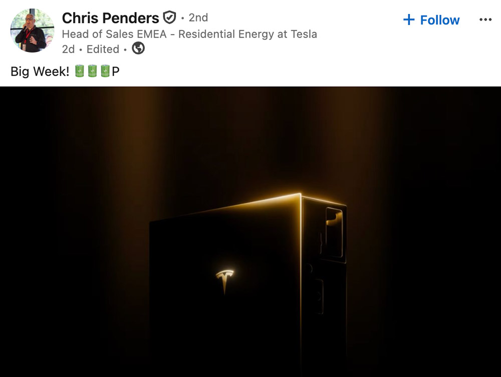 Auslöser für die Spekulationen ist ein kurzer Beitrag von Chris Penders auf LinkedIn. Der Tesla-Manager veröffentlichte dort lediglich den Hinweis auf eine „große Woche“ und kombinierte diesen mit drei Batterie-Emojis sowie dem Buchstaben „P“: