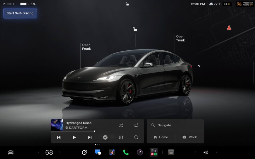 Für neuere Model 3 und Model Y (Highland und Juniper) verbessert Tesla die Fahrzeugdarstellung. Eine neue Parkumgebung und detailreichere Grafiken sorgen für eine realistischere Darstellung.